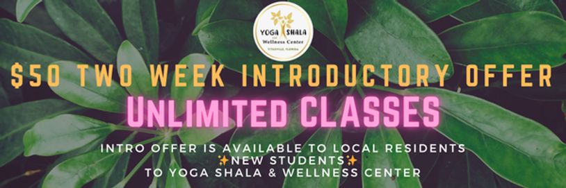 TWO WEEKS of Unlimited Yoga for Only $50. This is no-obligation rate for first-time students living in the local area. To qualify for this offer, you must be a new student to the Yoga Shala studio and a local resident to the Brevard county and surrounding areas.