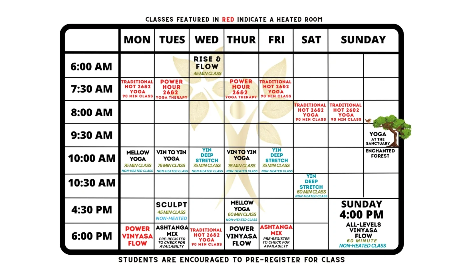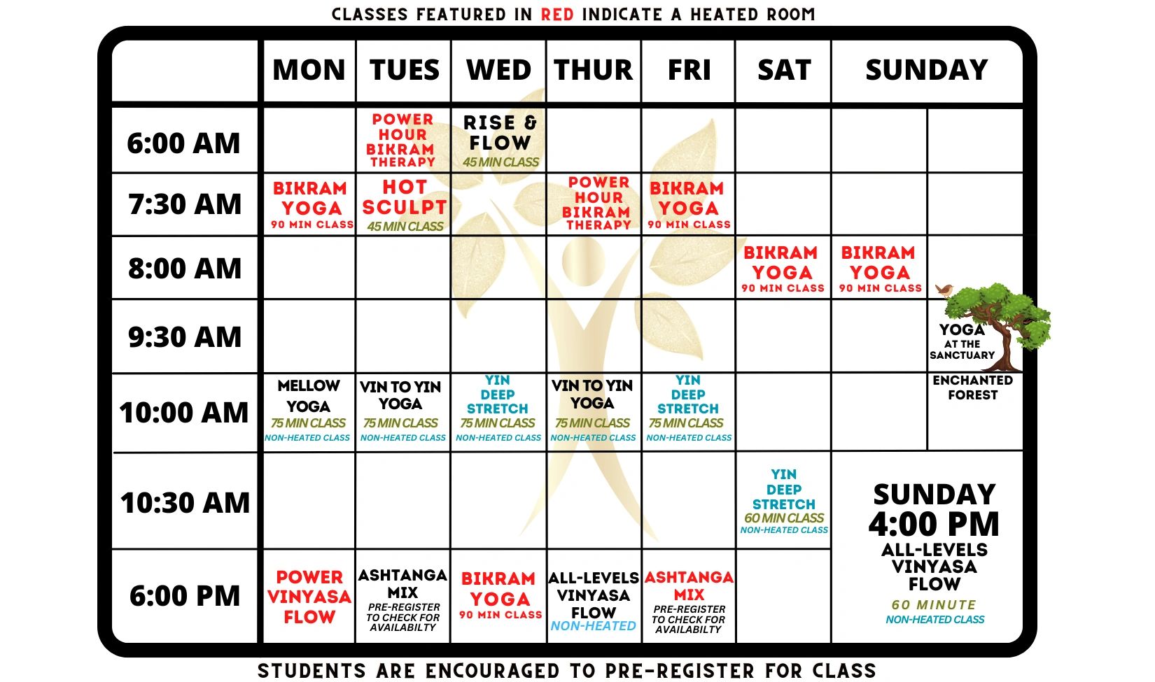 Please take a look at the schedule below to determine the class you're interested in attending, then scroll down a little further for the link to pre-register for class.